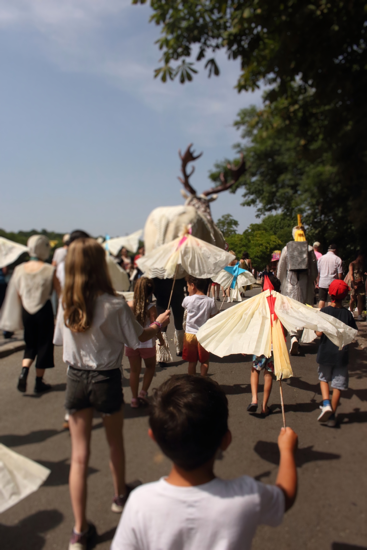 Avec Nuée, la Cie Espace Blanc souhaite s’aventurer sur les chemins du rite festif, au contact des populations le temps d’une représentation, mais aussi en amont avec des projets de territoire propices à la rencontre. Tandis que le cerf touche au spectaculaire et à la fête populaire, la nuée permet d’être en interaction avec les publics et de prendre le temps d’échanger et de construire ensemble. Réinvestir le tissu du vivant, renouer des liens entre humains et non humains pour manifester joyeusement l’énergie et la joie d’être ensemble, voilà ce à quoi la Nuée aspire.