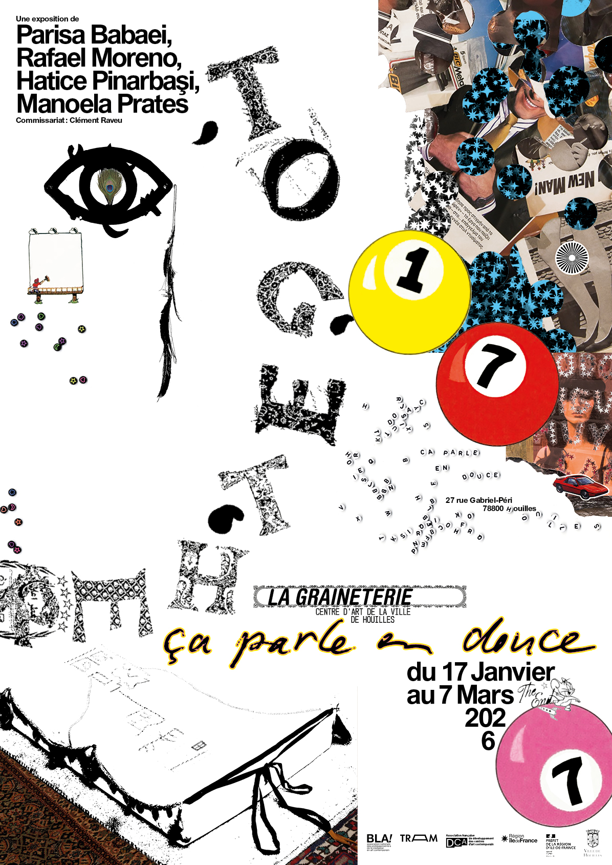Affiche de l’exposition « ça parle en douce », 2026, avec Parisa Babaei, Rafael Moreno, Hatice Pinarbaşi, Manoela Prates, commissariat : Clément Raveu, La Graineterie – Centre d’art de la Ville de Houilles. Conception graphique : Sarah Vadé
